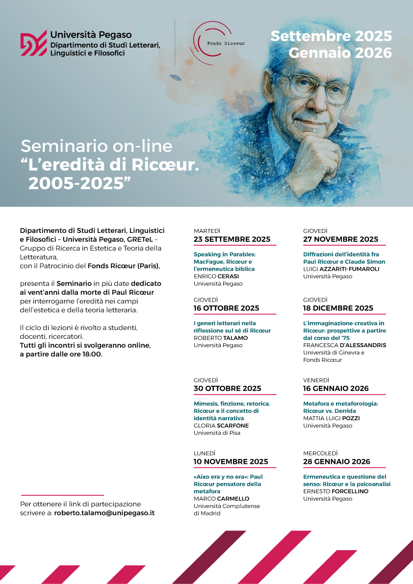 September 2025-January 2026 Seminario in più date dedicato ai vent’anni dalla morte di Paul Ricœur per interrogarne l’eredità nei campi dell’estetica...